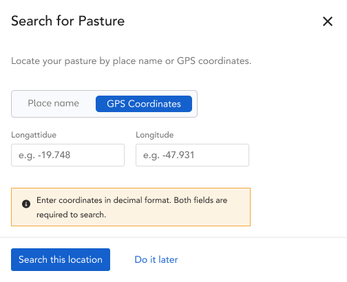 Search button opens a modal, where users have both ways of searching for their pasture.