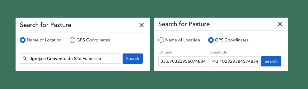 Multiple iterations were designed to explore possible solutions. I focused on making task of searching pasture was obvious, has some context to help (search by GPS coordinates & location name, doesn’t shatter our design system.