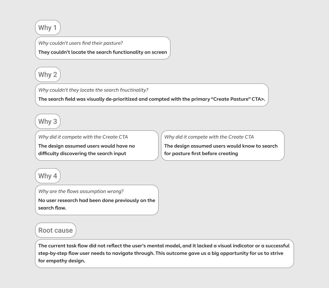 Rather than jumping to solutions, I used the Sakichi Toyoda 5 Whys method to trace to problem. Doing so, I discovered a lack of empathy in information hierarchy.