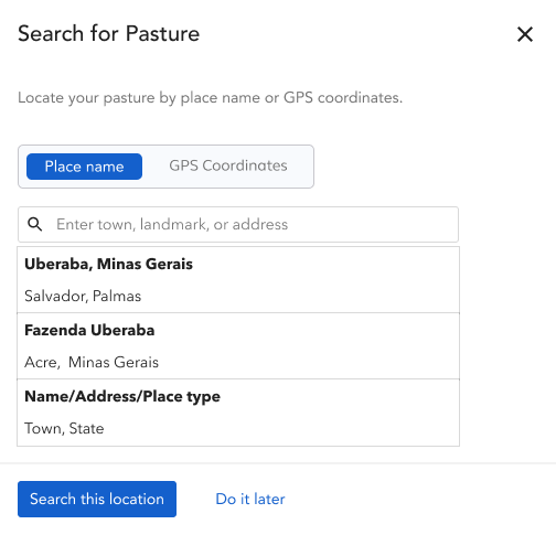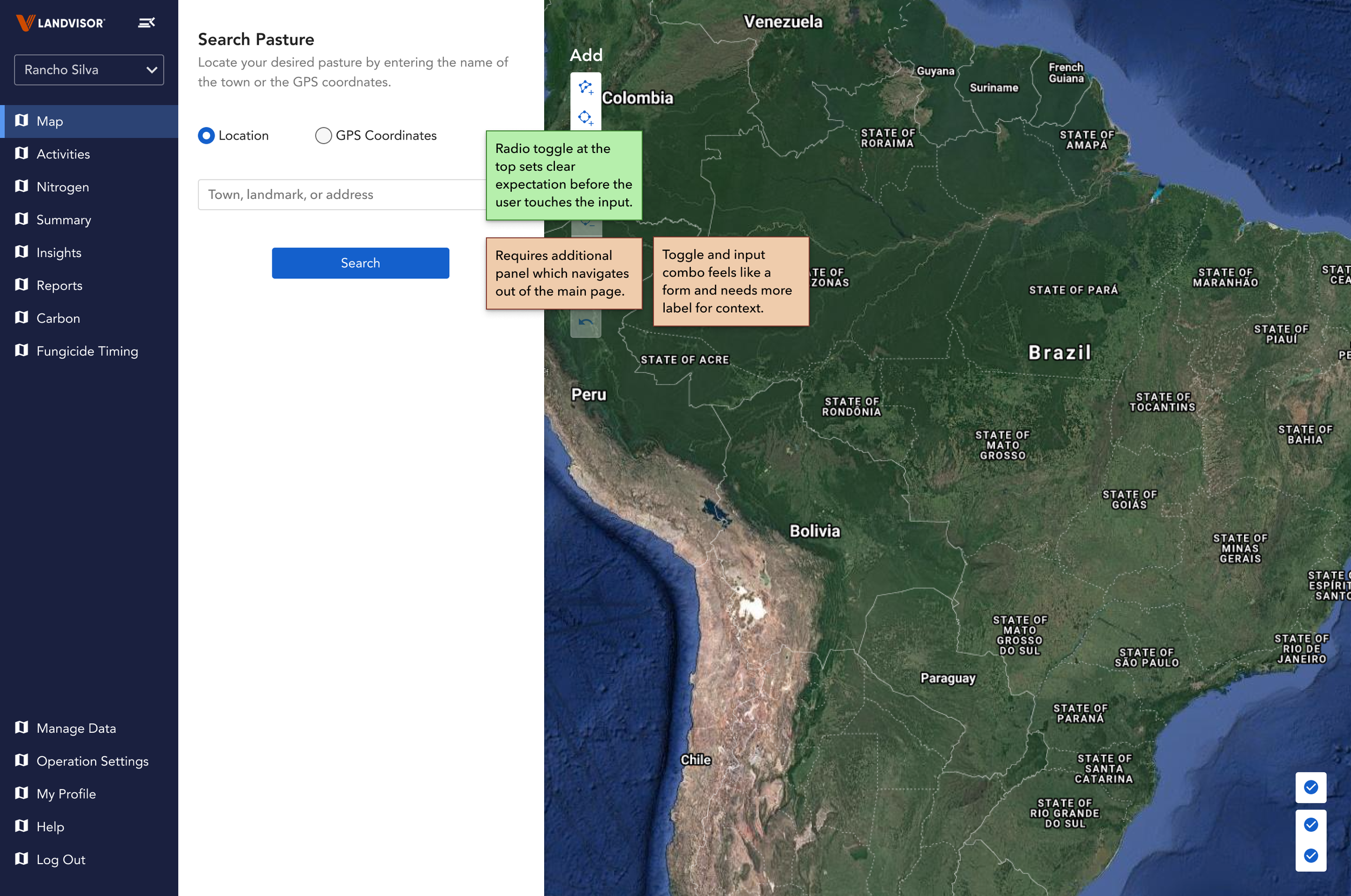 Unlike earlier concepts that embedded search inside the form panel or used a generic modal, this design made 'Search for pasture' a visually distinct with a dedicated button.