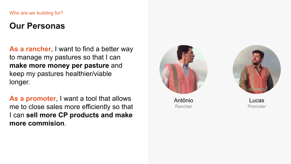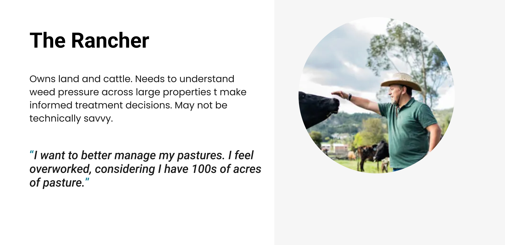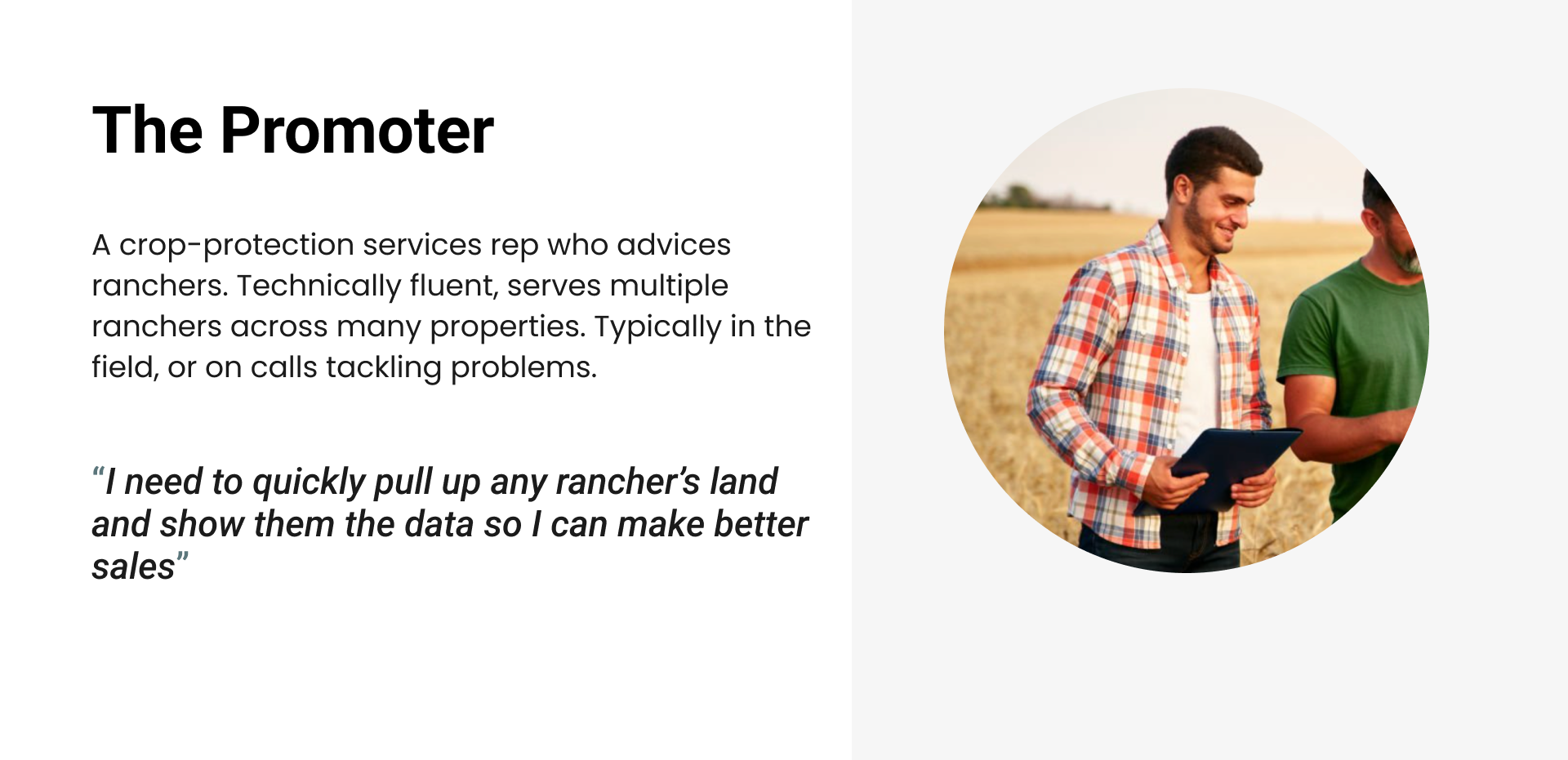 The product involves touch-points of 2 key users. A rancher who owns the land and cattle, and a promoter who serves the rancher by helping them make decisions and directly provide crop protection services.