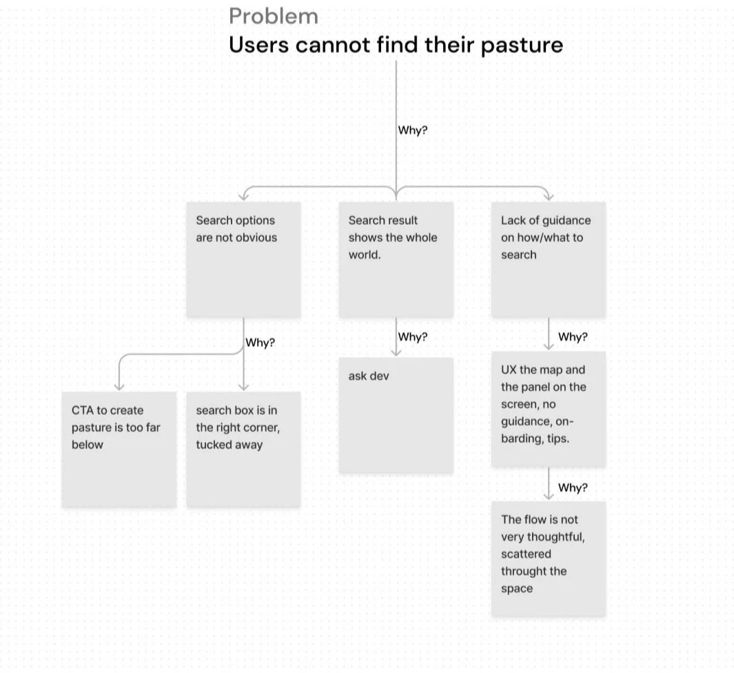 Using the Sakichi Toyoda’s method of 5 why’s, I dived into understanding why users are having problems locating their pasture on the map. Found out we have 2 core problems: the techninal issue, which I worked with the dev team to solve, and lack of empathy in design. The tested design did not provide a good order or flow for users to complete their tasks.