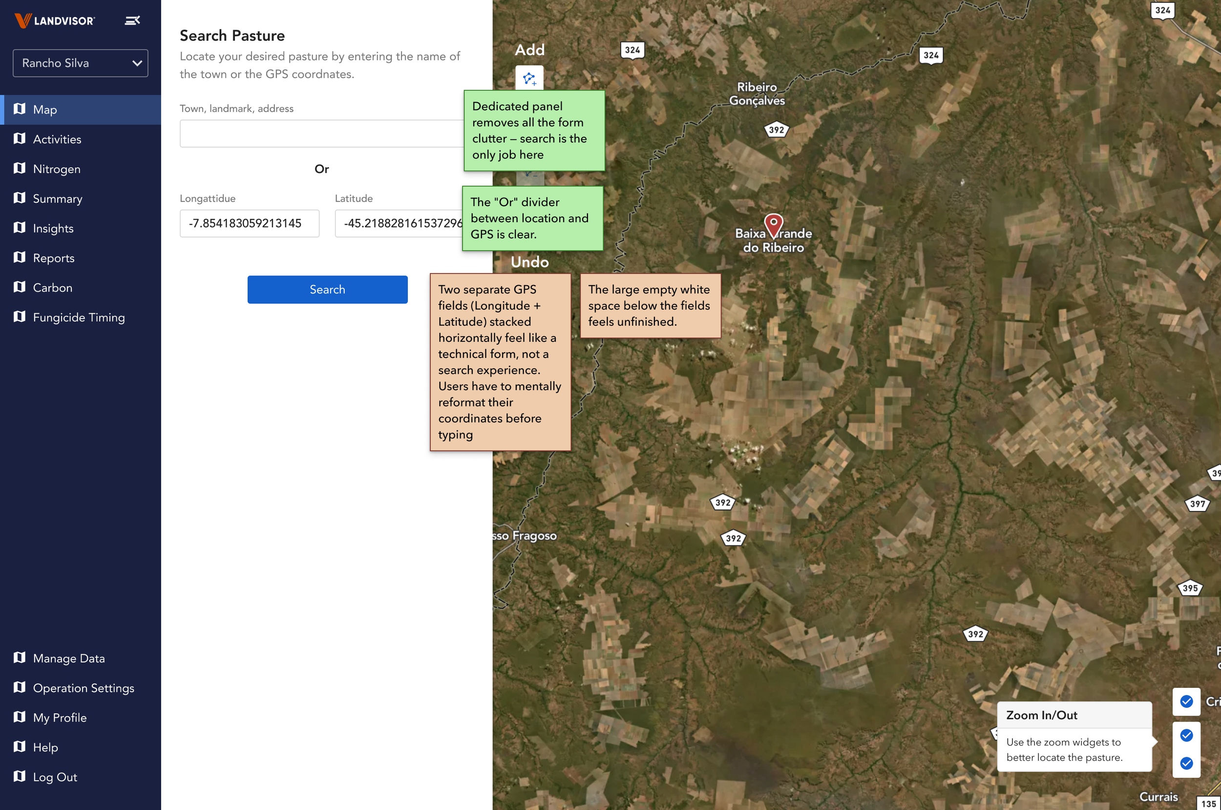 A usability-led redesign of pasture field search for Brazilian ranchers, from UX failure into a seamless experience.