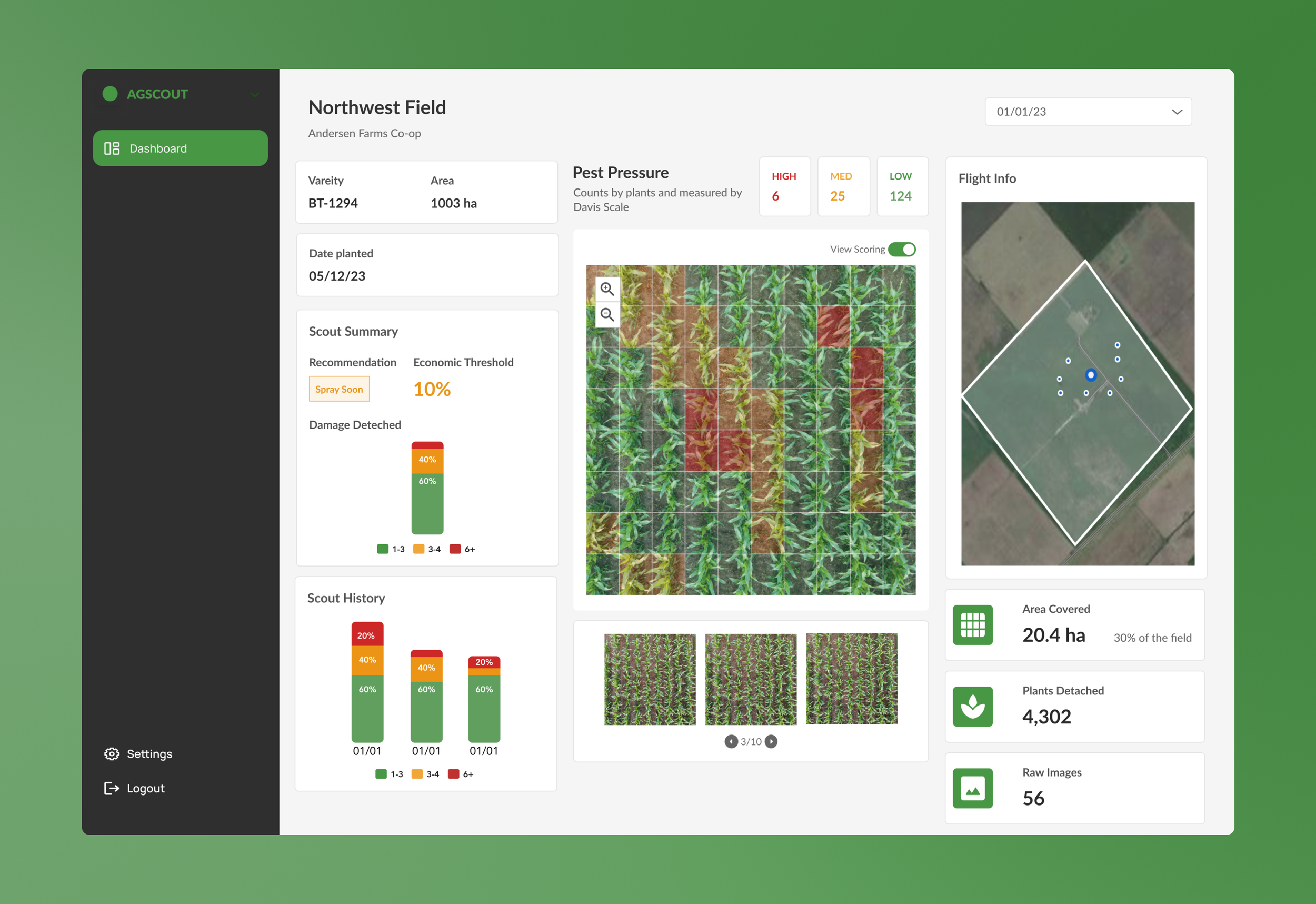 Once in a field detail page, the dashboard consists of field info, scouted data, scouted data history, raw images with or without scoring, and flight info.