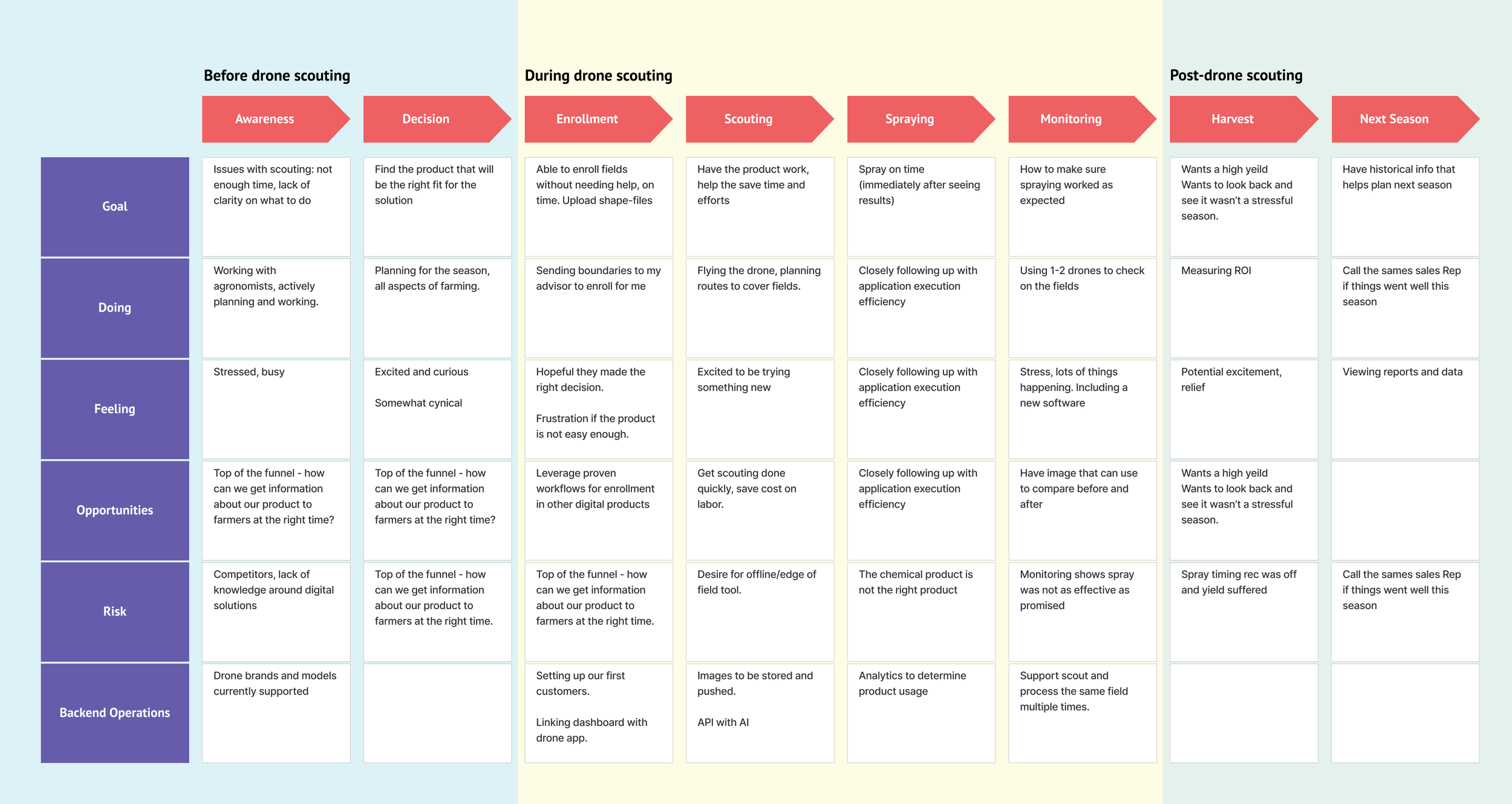 We kicked-off the sprint with customer journey mapping by contributing our own knowledge of the user and the problem space. Collaborating with Product team as well as Marketing, Agronomy, Education and Technical team, we successfully captured a holistic journey that covered all aspects of the user journey.